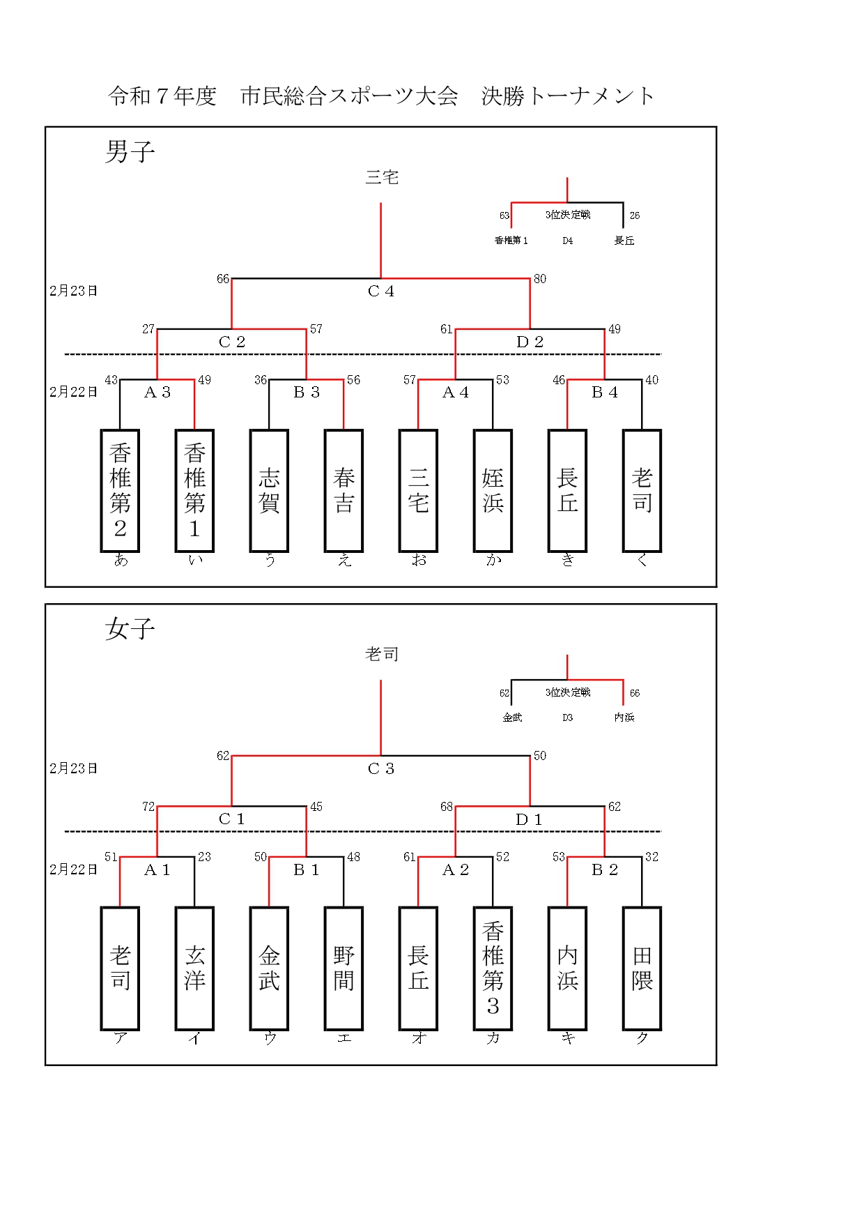 R7年度 市民総合スポーツ大会 男子決勝 三宅80-66春吉 優勝 三宅 2位 春吉 3位 香椎第1・長丘 女子決勝 老司62-50長丘 優勝 老司 2位 長丘 3位 内浜・金武 リーグ編成 組み合わせ 日程 最終結果 関連記事・速報 #市民総合